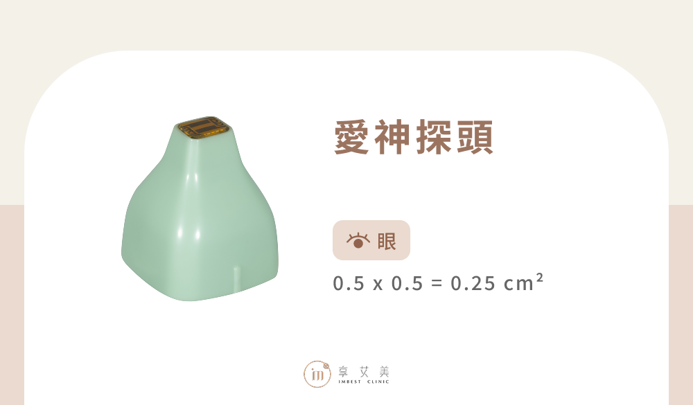 無雙電波的愛神探頭是一款適用於眼周的探頭類型,具備免下壓施打設計,可以舒適地淡化眼周細紋。愛神探頭的作用面積為 0.5cm × 0.5cm(0.25cm2),每顆探頭都有 600 發的能量。