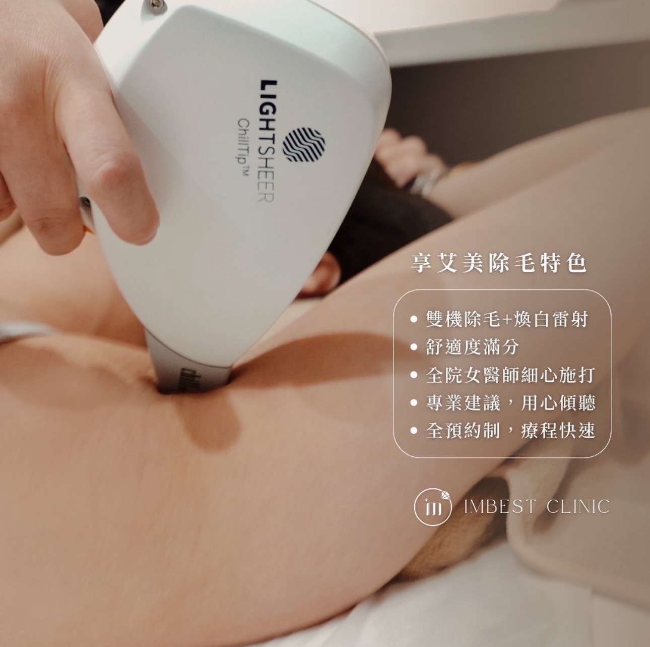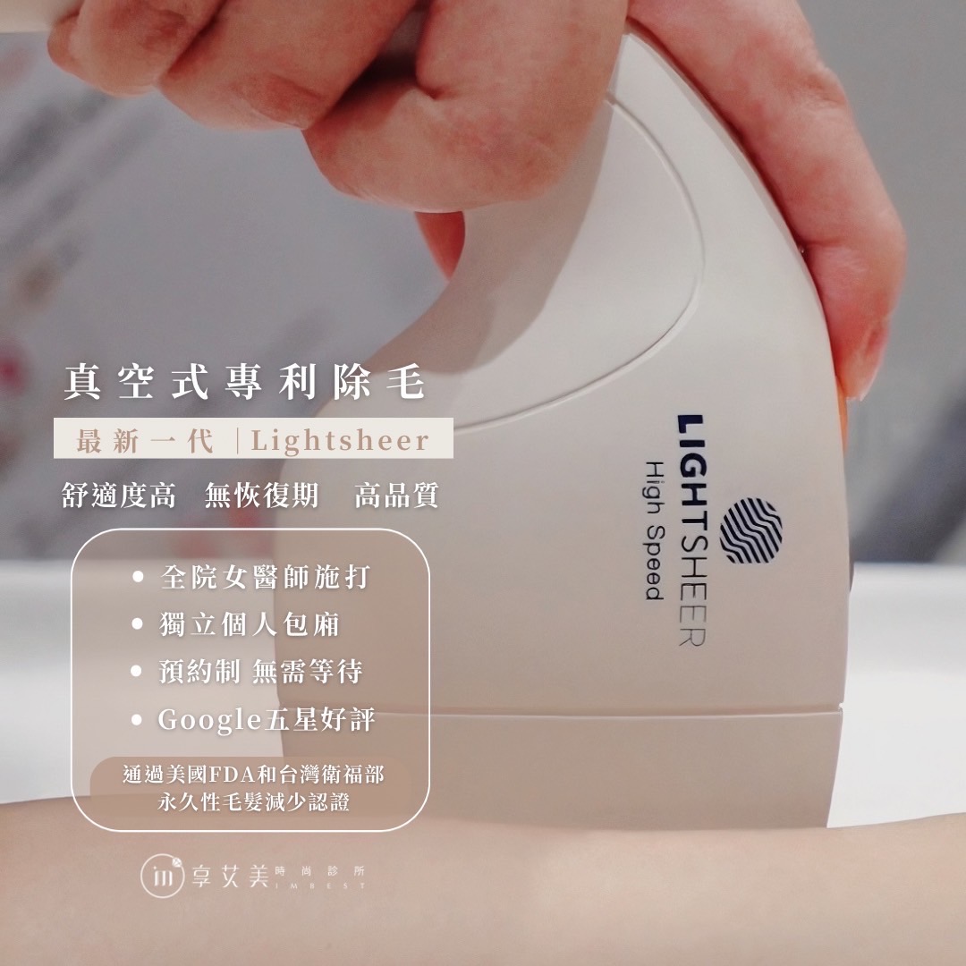 - 優點:雷射除毛的優點,就是在幾個月或幾年內無需反覆除毛,新生毛髮也會比以往更細軟、毛量也更少,手部、腿部、腋下、私密處除毛都適合,想維持長時間的除毛效果首推雷射除毛。