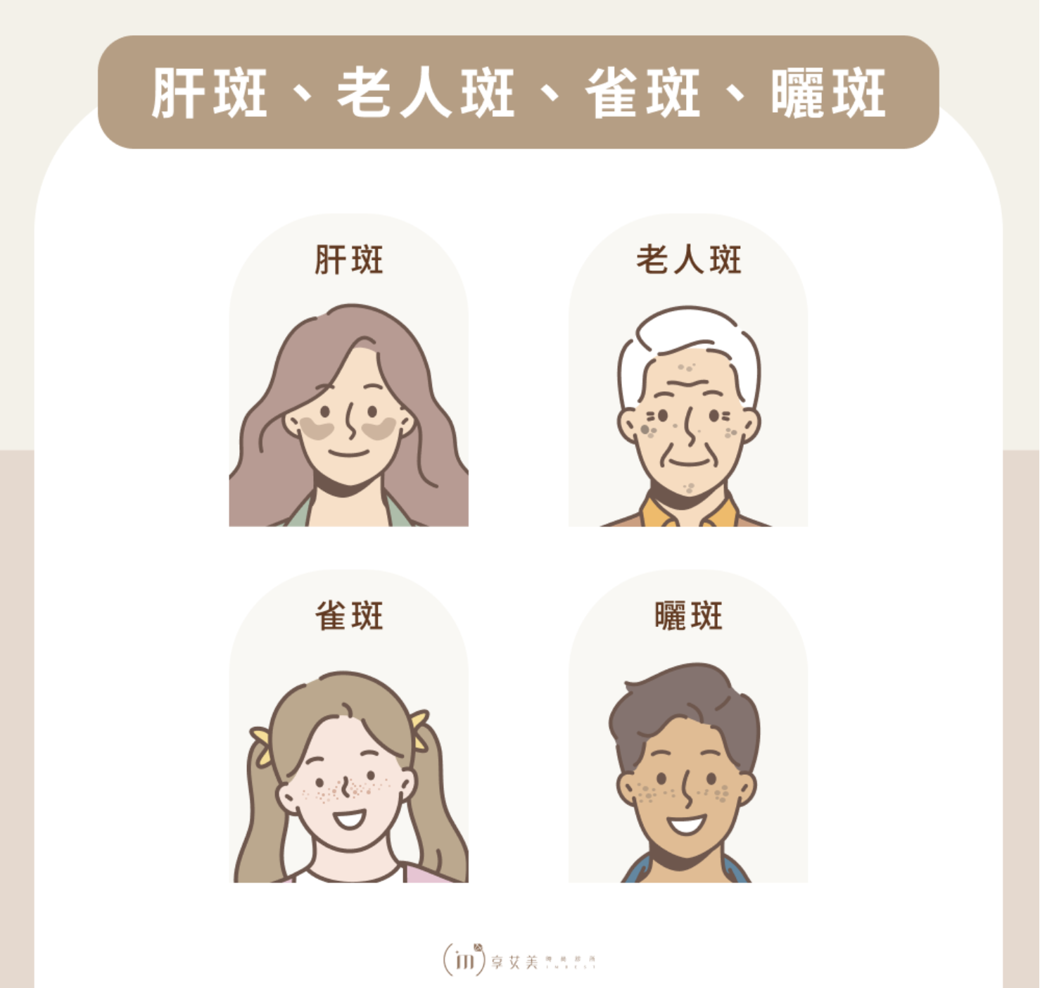 - 老人斑:多呈現為塊狀,屬於後天性斑點,生長於表皮層,好發於 40~60 歲群體。