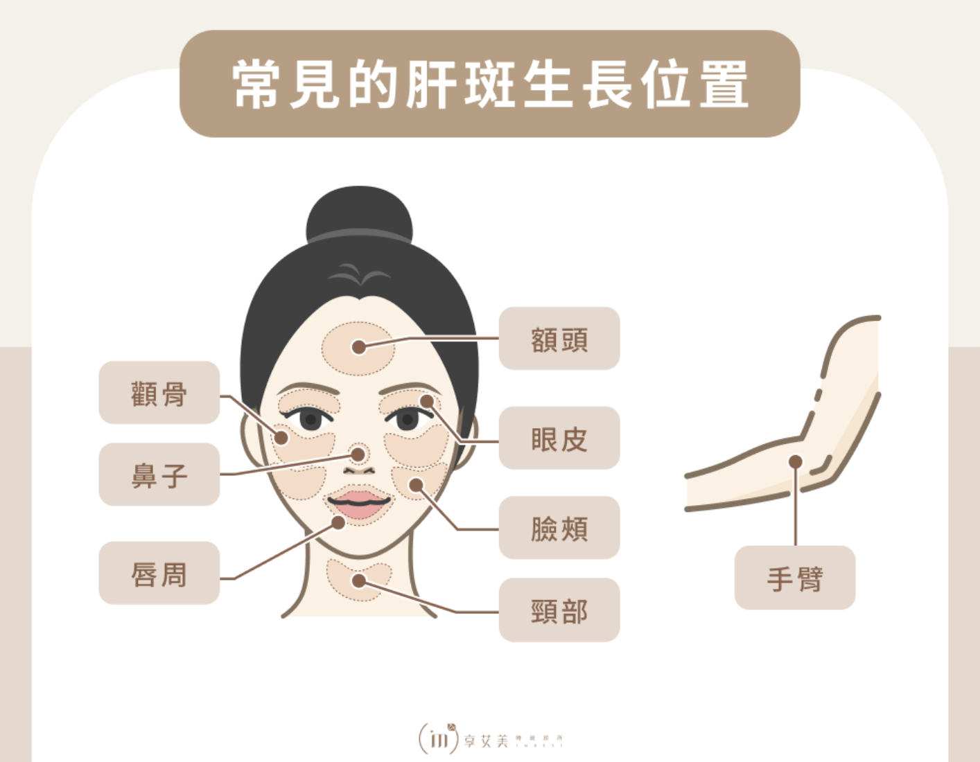 - 肝斑:多呈現為片狀,屬於後天性斑點,生長於表皮、真皮層之間,好發於女性、孕婦。