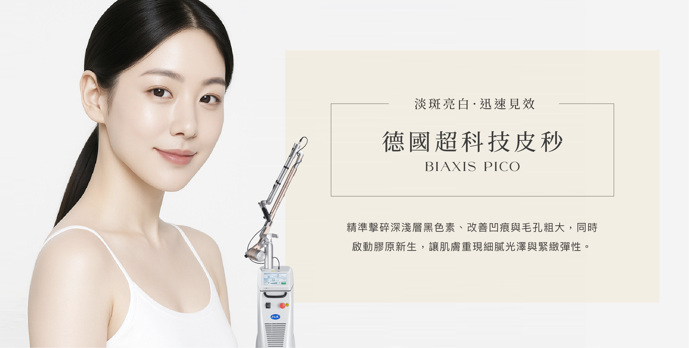 由知名藝人林熙蕾代言的德國超科技皮秒 BiAxis PICO,來自德國原廠 HLS HyperTech,是一項結合了軍用航太衛星技術和極致工藝美學的第 3 代進階皮秒療程。