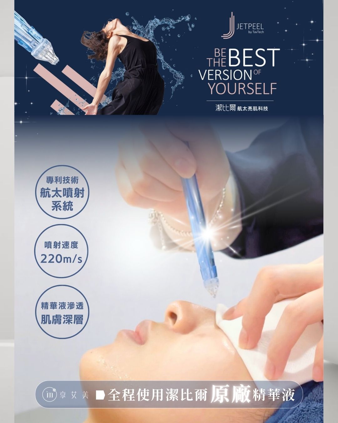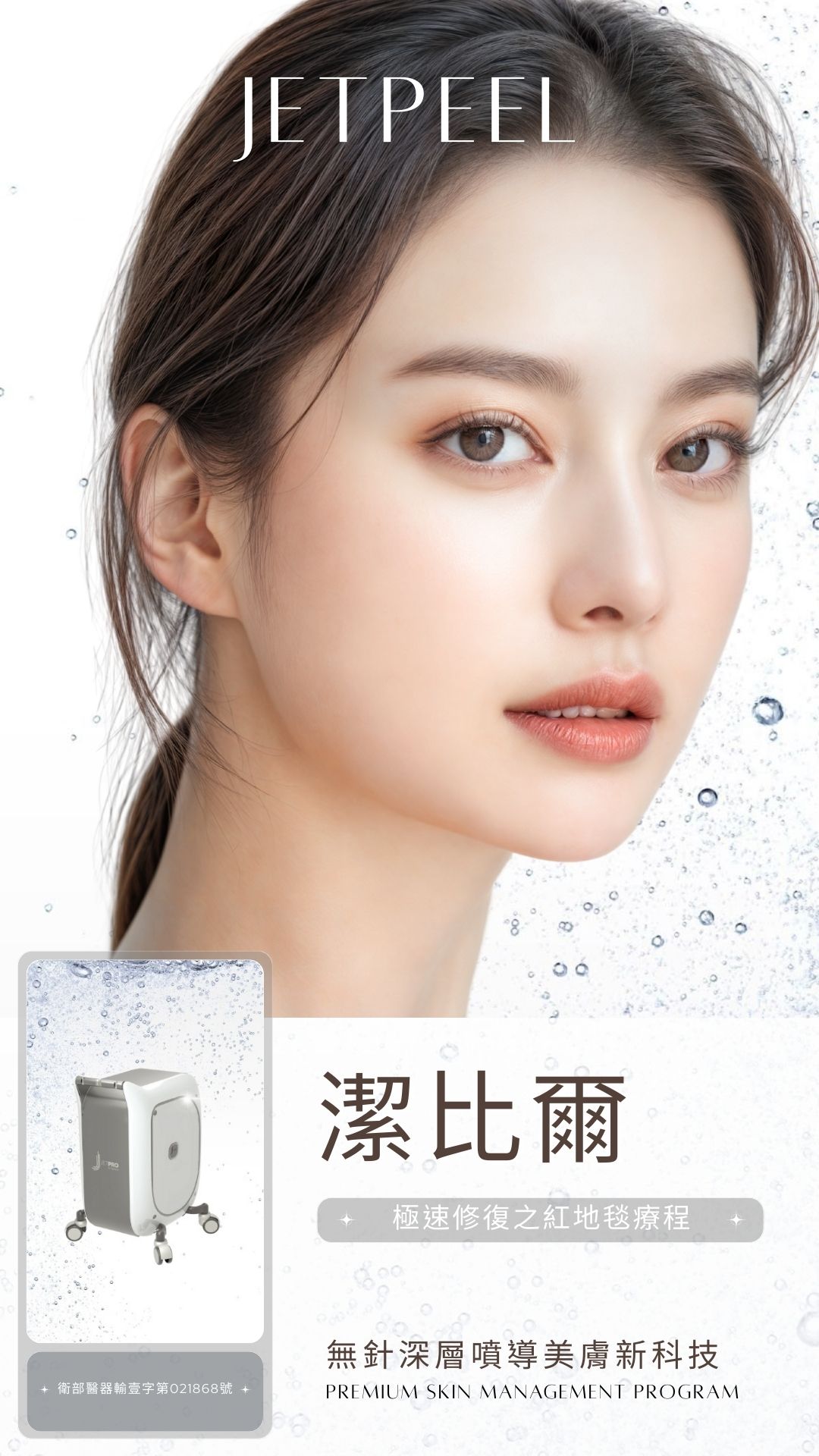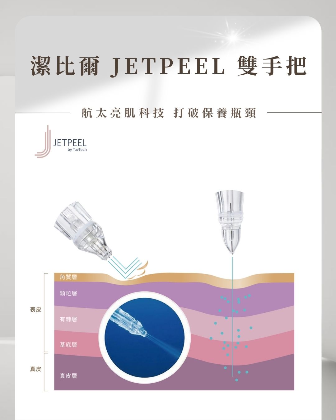『潔比爾 JETPEEL』 採用泰芙特公司研發新一代潔比爾航太亮肌科技設備「JETPRO」,是一款:非侵入性、無傷口、無熱破壞、無術後照護、術後即可上妝的紅地毯頂級皮膚管理課程。