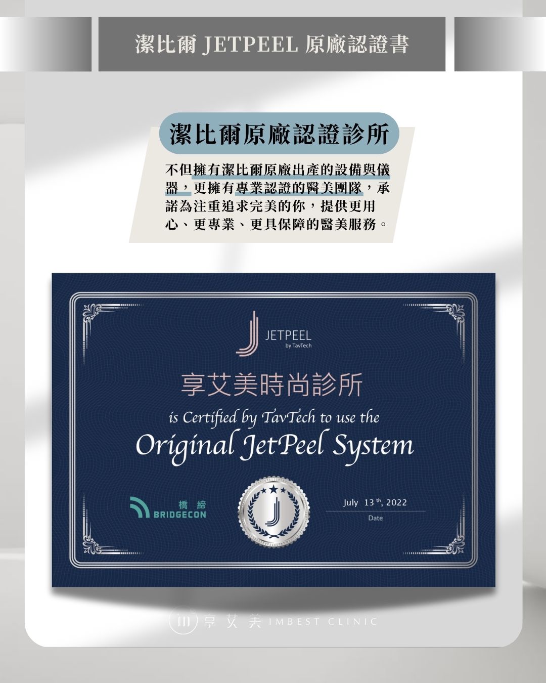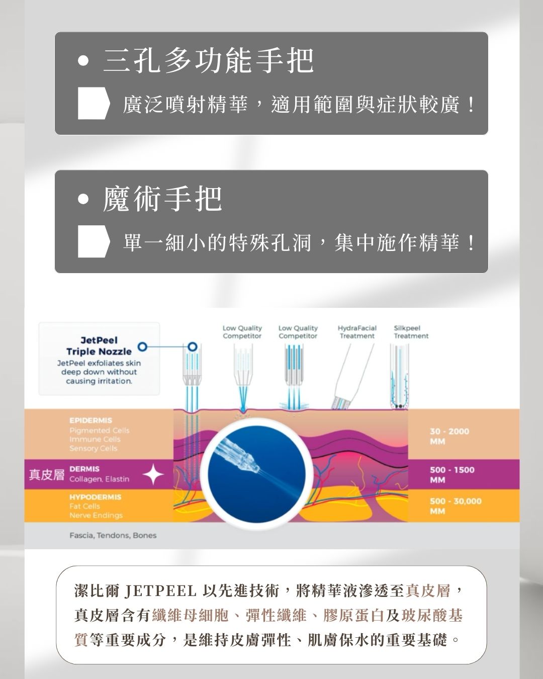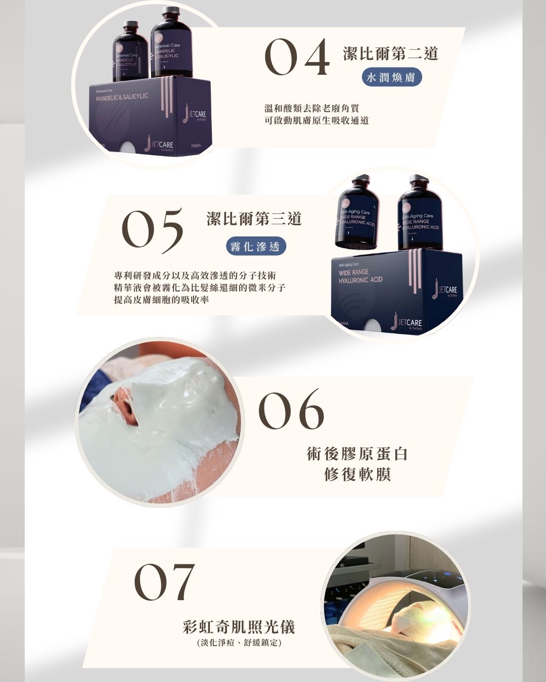 『潔比爾 JETPEEL』 採用泰芙特公司研發新一代潔比爾航太亮肌科技設備「JETPRO」,是一款:非侵入性、無傷口、無熱破壞、無術後照護、術後即可上妝的紅地毯頂級皮膚管理課程。