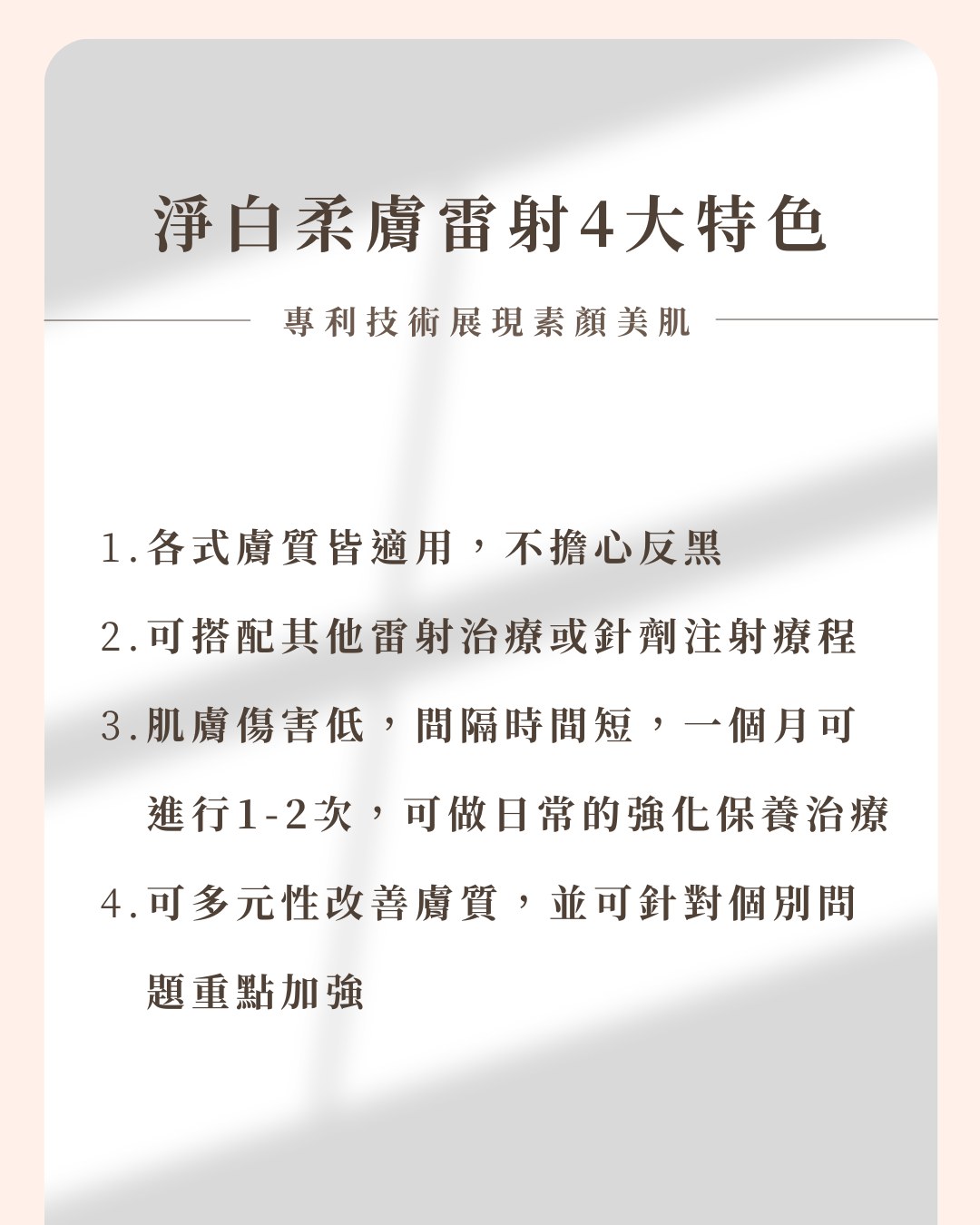 在除斑療程中,能針對治療部位調整波長,深黑色素被擊破後,再經由人體的自癒代謝機制,將被擊破的黑色素逐層代謝出去。不只是針對斑點,淨膚雷射治療同時會提升皮膚的透明感及彈性,膚色會較為均勻、透亮、白皙,整體毛孔細紋、粉刺、青春痘、紅斑及皮脂腺調理也有改善。