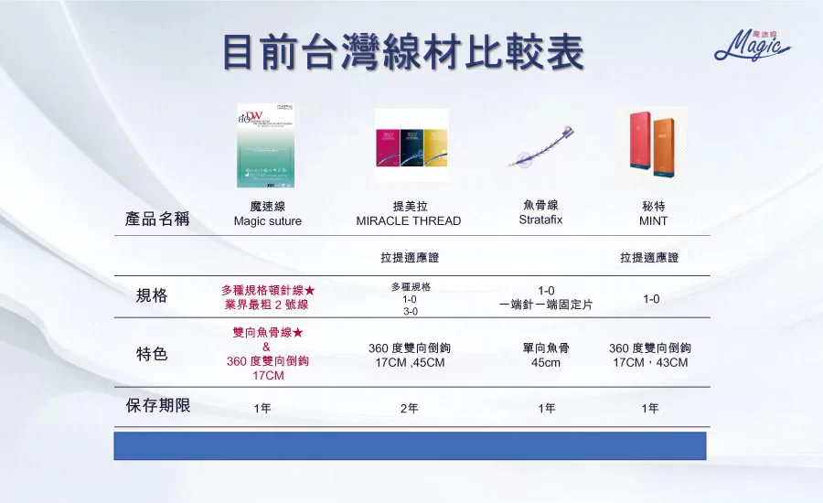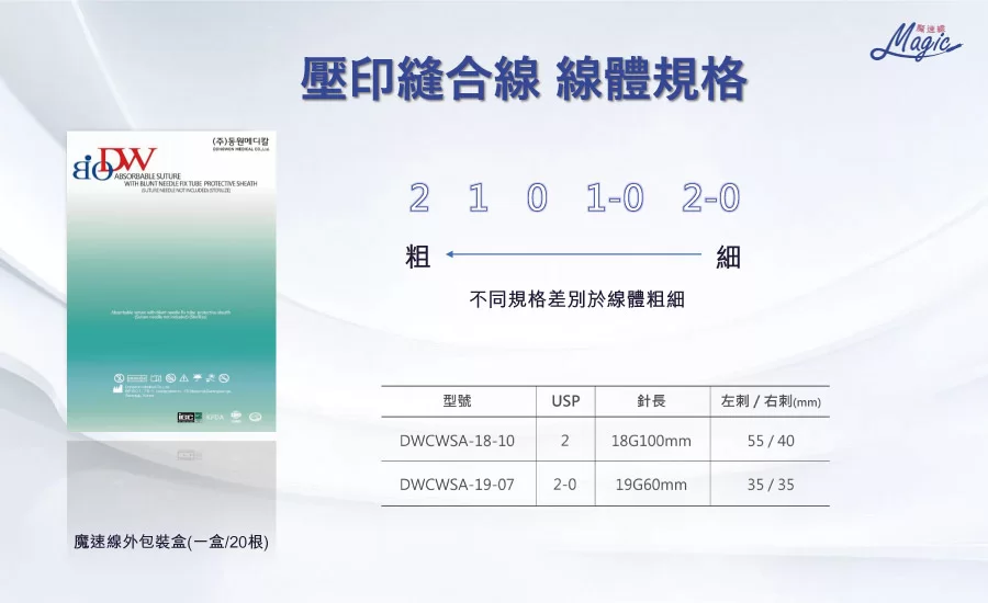 【 線材中持續最持久 】魔速線是可吸收線材料中維持時間最久的,且提供目前最粗USP2號線,線體越粗表示持久度越好,組織固定時間也可以更長。