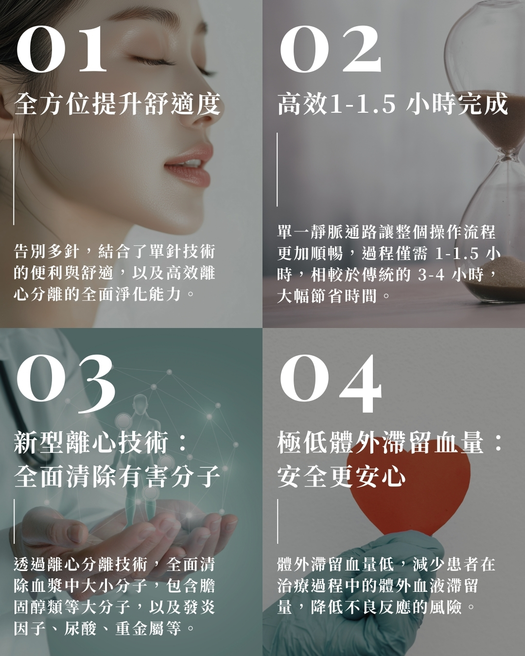 淨化後的血液會與代用血漿混合,並經由靜脈安全回輸體內,過程全程由醫療人員嚴密監控,確保舒適與安全。