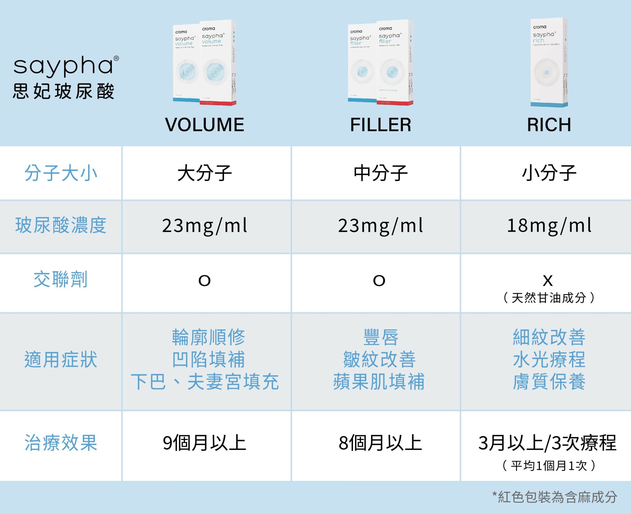 Saypha 系列包含 Rich、Filler、Volume、Volume Plus,不僅依照濃度與黏彈性分類,更依照部位需求調整流動度與支撐度。