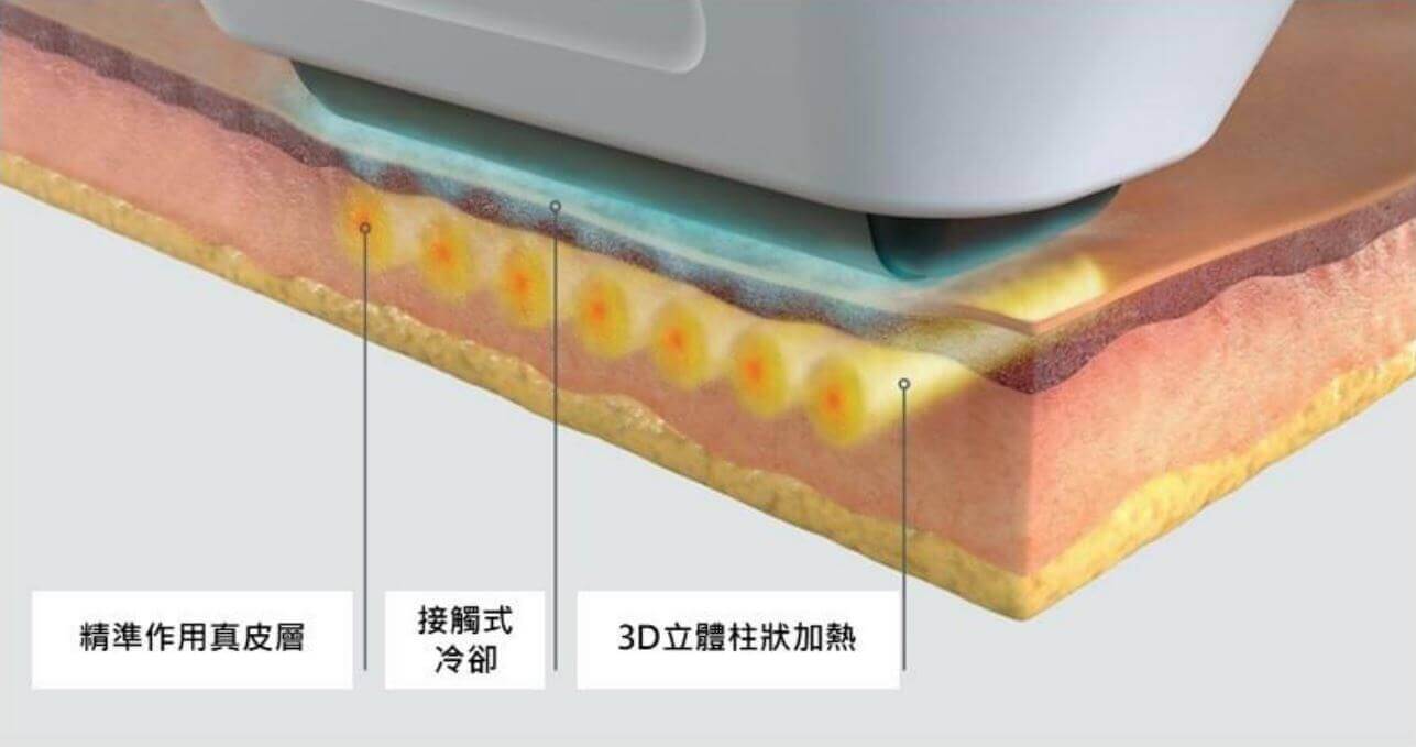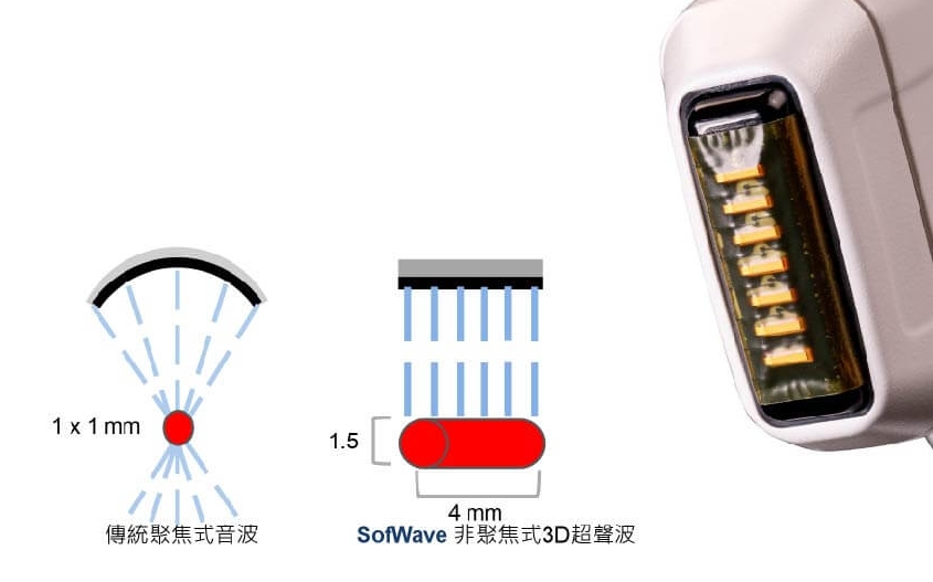 Sofwave索夫波® 探頭是單發輸出7排3D立體能量柱,使用SUPERB™(Synchronous Ultrasound Parallel Beam) 技術做非聚焦的容積式加熱。