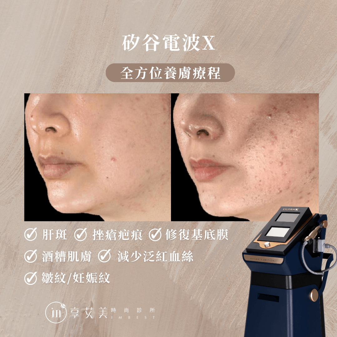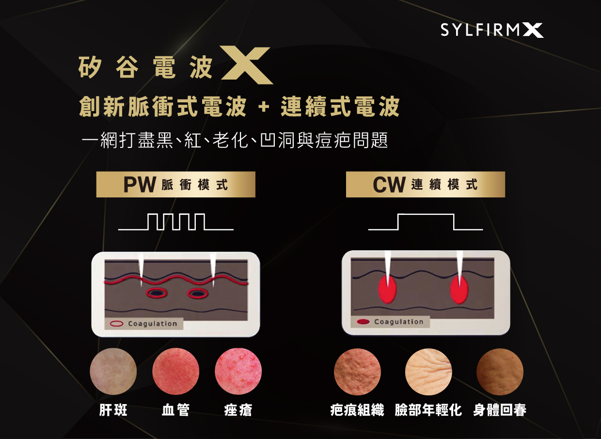 可修復影響肌膚問題的根源,更能讓皮膚維持年輕化 且無瑕狀態。顛覆以往傳統微針電波的連續加熱,同時擁有「脈衝式電波」和「連續式電波」的科技, 客製化處理皮膚的黑、紅、老化、凹洞痘疤問題。矽谷電波X 通過美國FDA雙模式微針電波認證、歐 盟CE、韓國KFDA認可,並於台灣衛福部TFDA認證取得肝斑、曬斑、改善痤瘡疤痕(痘疤)等適應症 ,能針對各種棘手肌膚做客製化的治療,創造全方位的養膚效果。