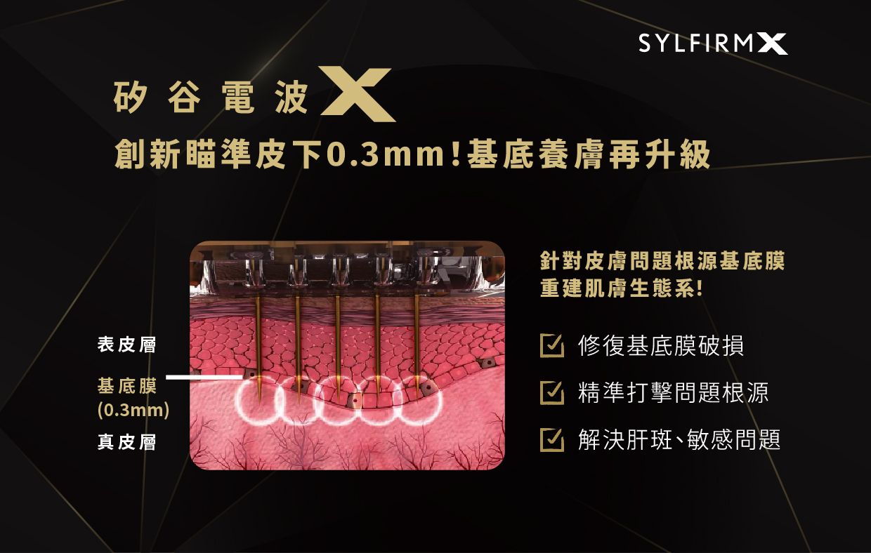 矽谷電波X 獨家 0.3mm 精準治療深度,能量直達基底膜與真皮乳突層,不僅有效改善肝斑、泛紅、酒糟等問題,更能針對 0.3mm 至 4mm 不同深度的肌膚層進行治療,達到全方位的肌膚修復與改善。相較於傳統微針電波僅作用於真皮層,矽谷電波X 突破限制,精準治療基底膜,為肌膚帶來更良好的改善!
