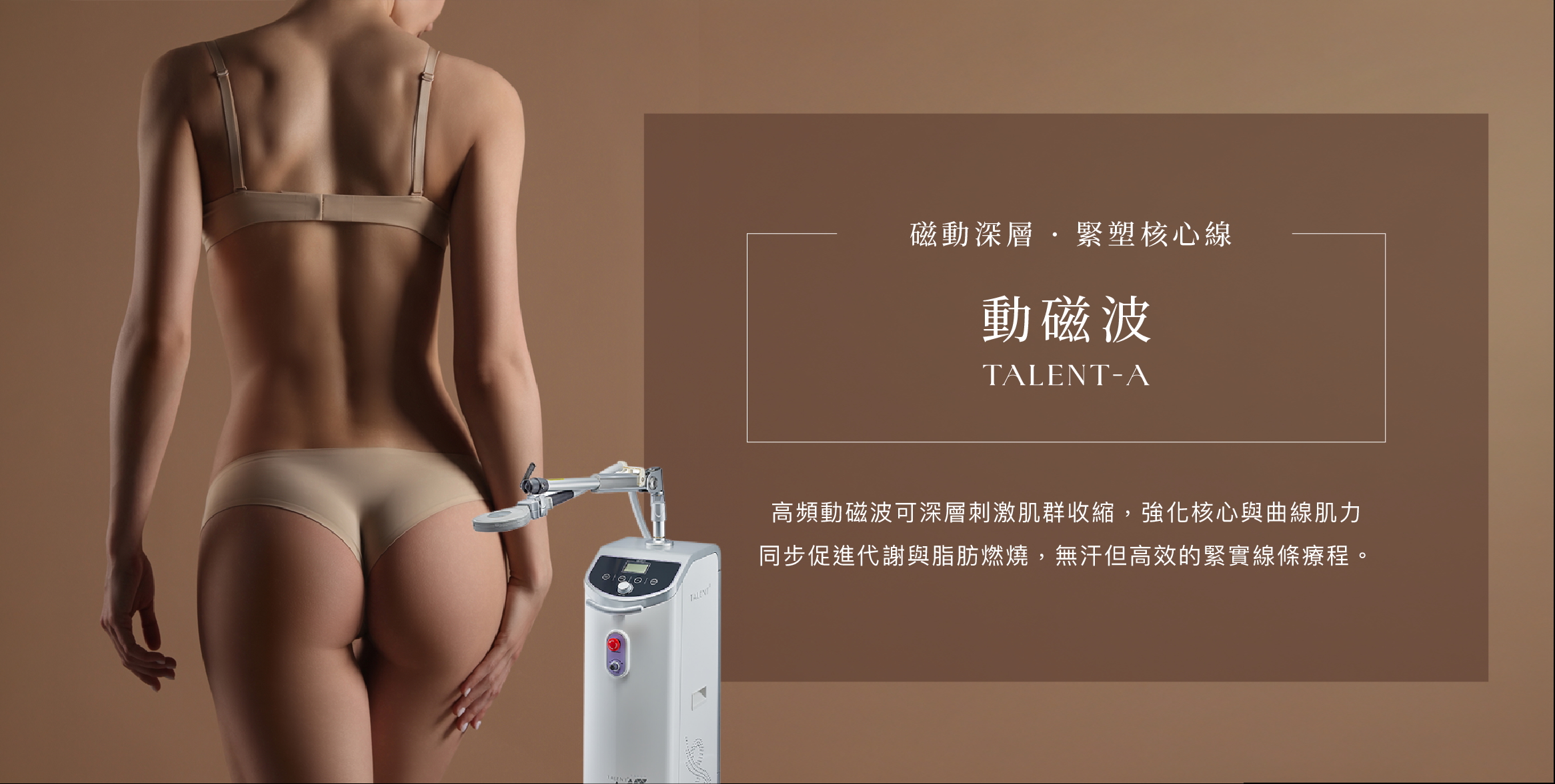 Talent-A 動磁波採用高強度聚焦電磁場 (HIFEM) 技術,透過渦電流刺激運動神經元,誘發深層肌群被動且間歇性收縮。單次 30 分鐘療程即可產生約 30,000 次肌肉收縮,強化肌肉密度與張力、改善線條,同時可作用於核心、臀腿、盆底等多處肌群。