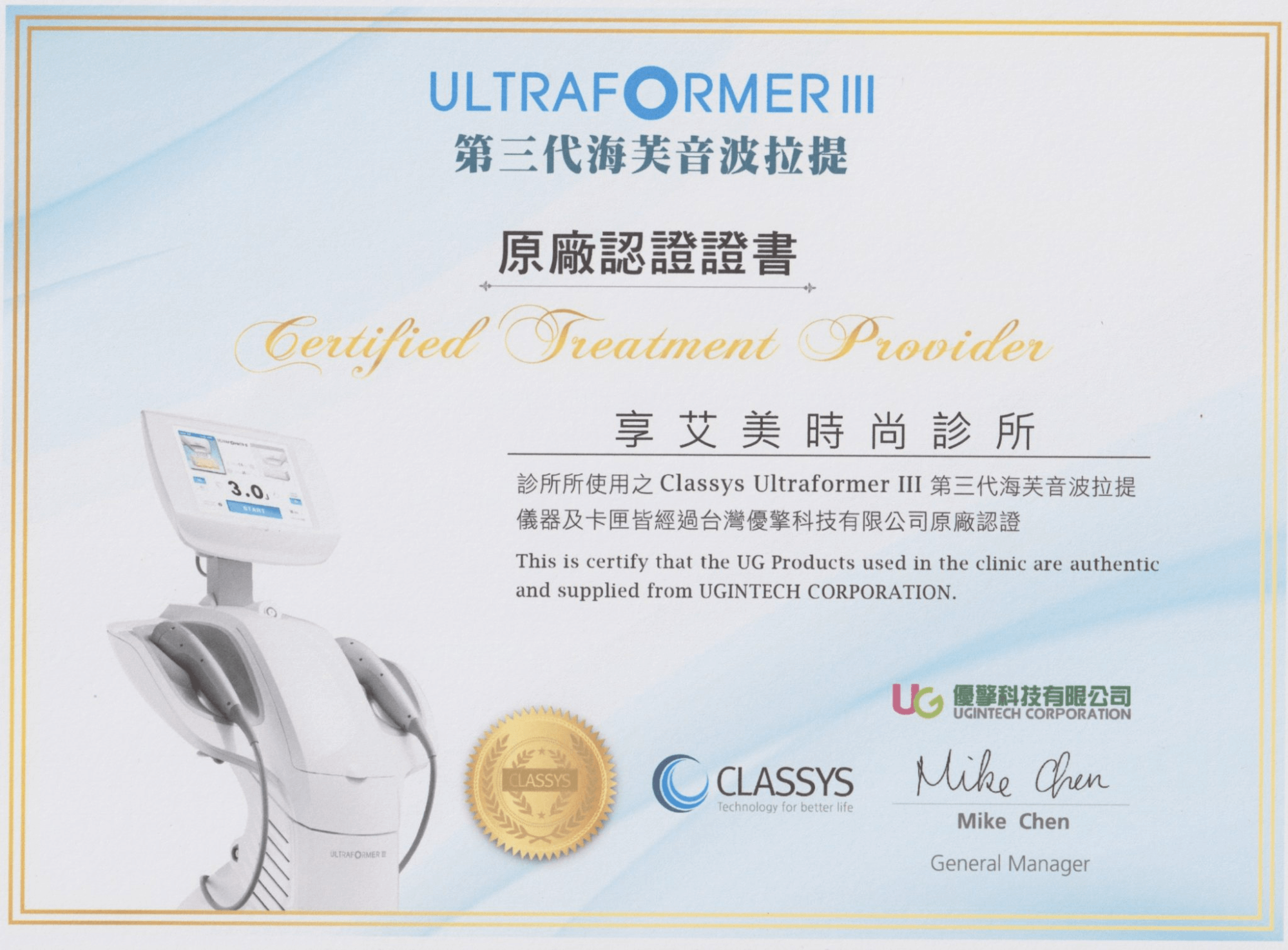 享艾美時尚診所擁有第三代海芙音波拉提 ULTRAFORMER III「原廠認證」 證書,保證本診所所使用的儀器及所有耗材皆為原廠正品,安全可靠,讓您在追求美麗的路上,享受最專業、最安心的拉提緊緻療程,美麗效果值得信賴。