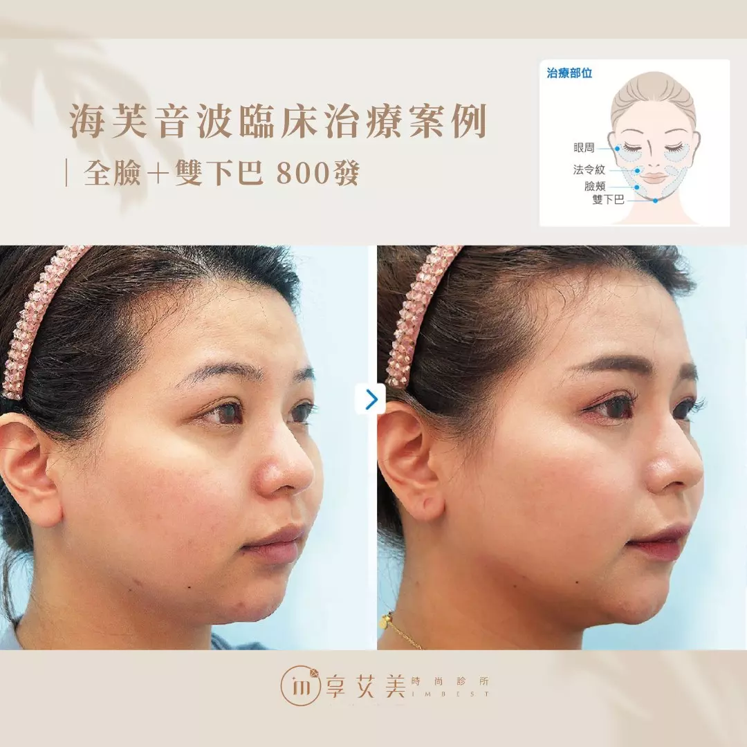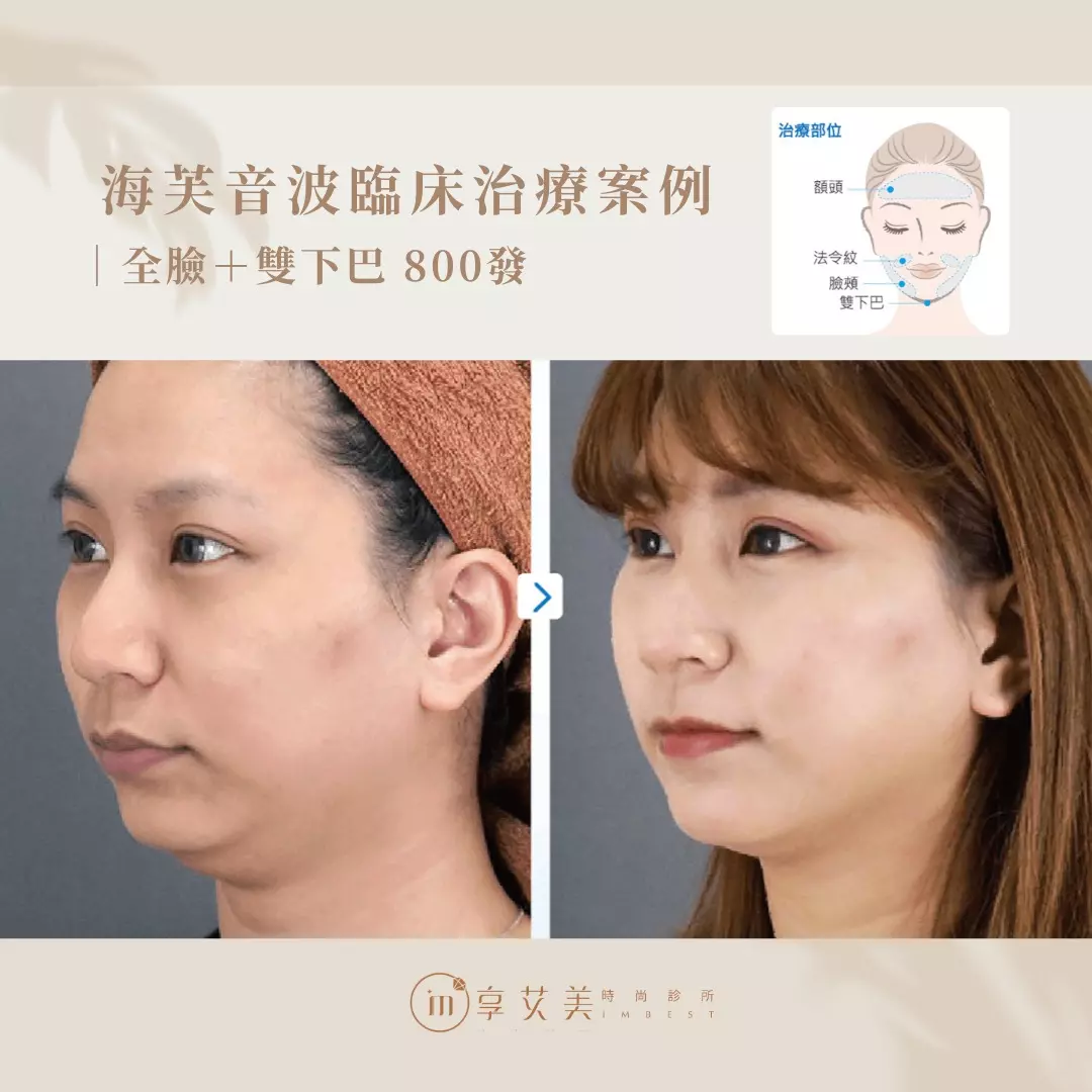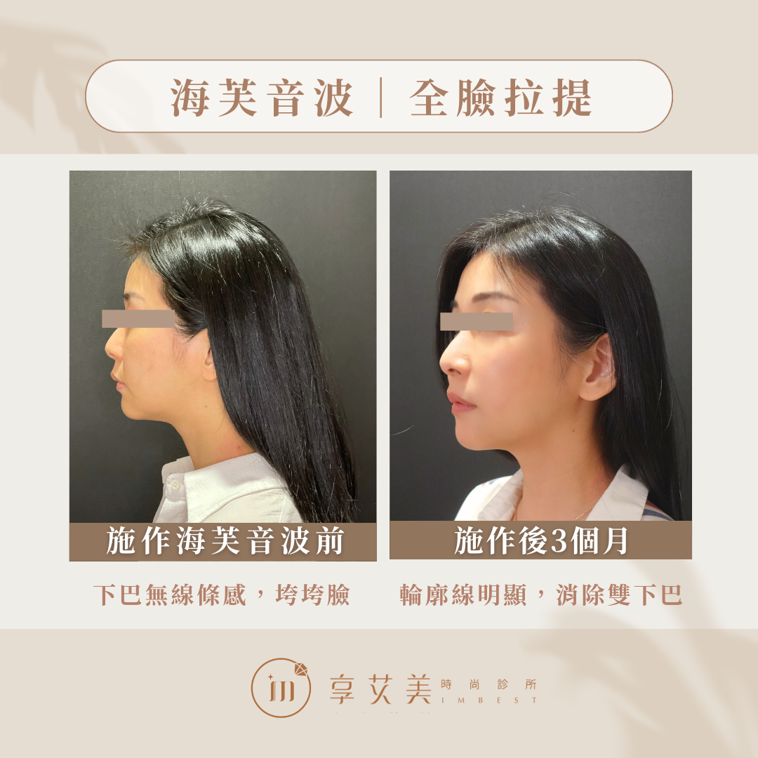 施作前,求診者的雙下巴區域組織顯得鬆弛、下巴線條模糊,整體臉型下垂缺乏立體度。透過海芙音波以不同探頭精準施打 800 發,使能量直達深層筋膜層(SMAS)與皮下脂肪組織等區域,我們可以看到下顎線條被清晰地上提與收緊,雙下巴問題明顯改善、雙眼變得更有神,臉頰整體輪廓也獲得提升,成功打造出更精緻、緊實的 V 型臉效果。